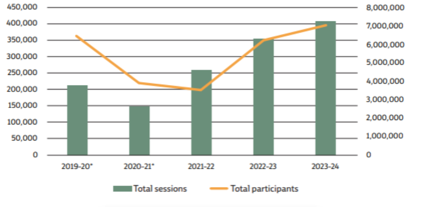 In 2023/24 public libraries delivered over 400,000 program sessions attracting over seven million participants. There were around 55,000 more sessions in 2023/24 than 2022/23, a 15% increase, and around 880,000 more participants reflecting a 14% increase (Figure 1).